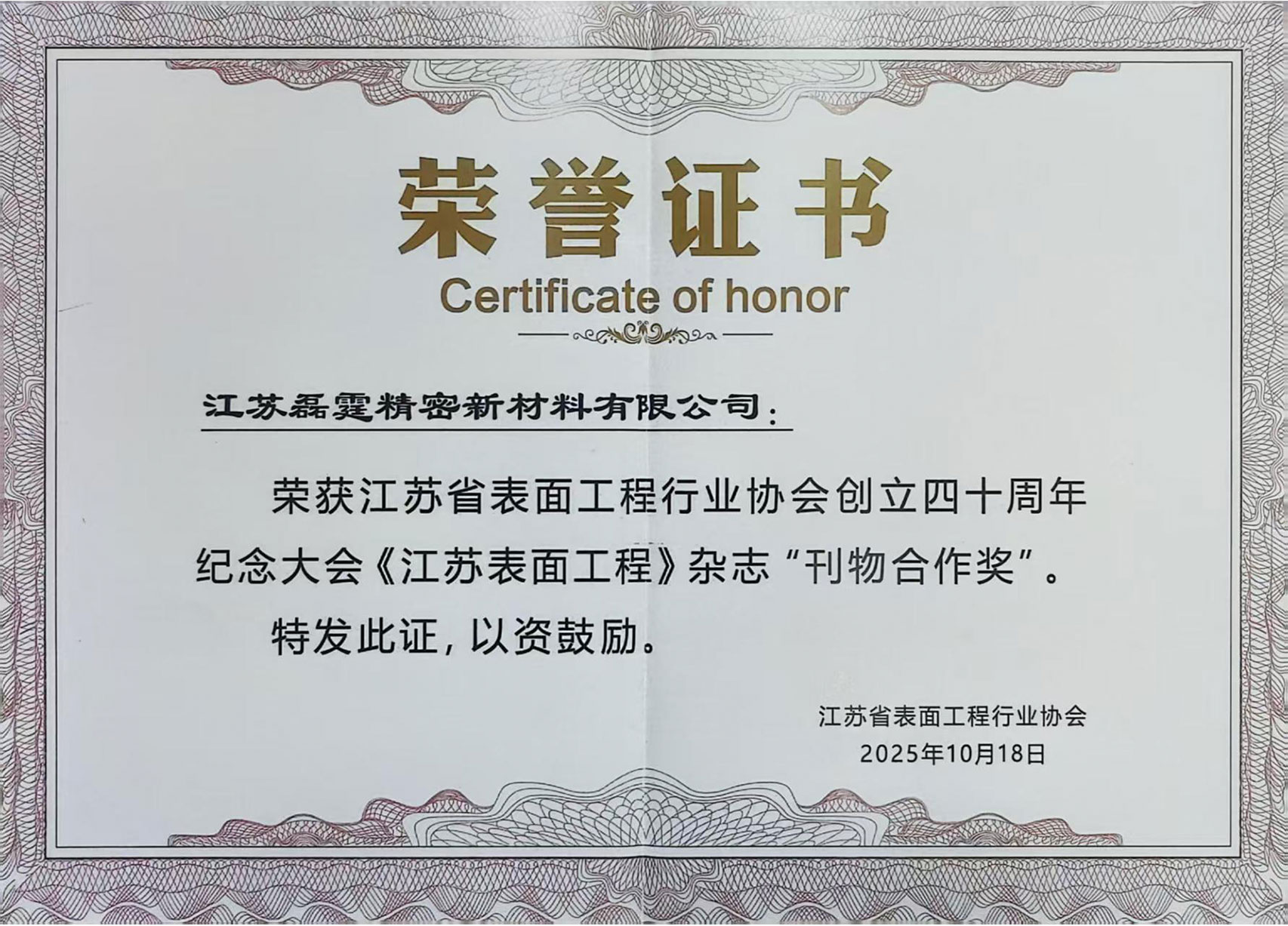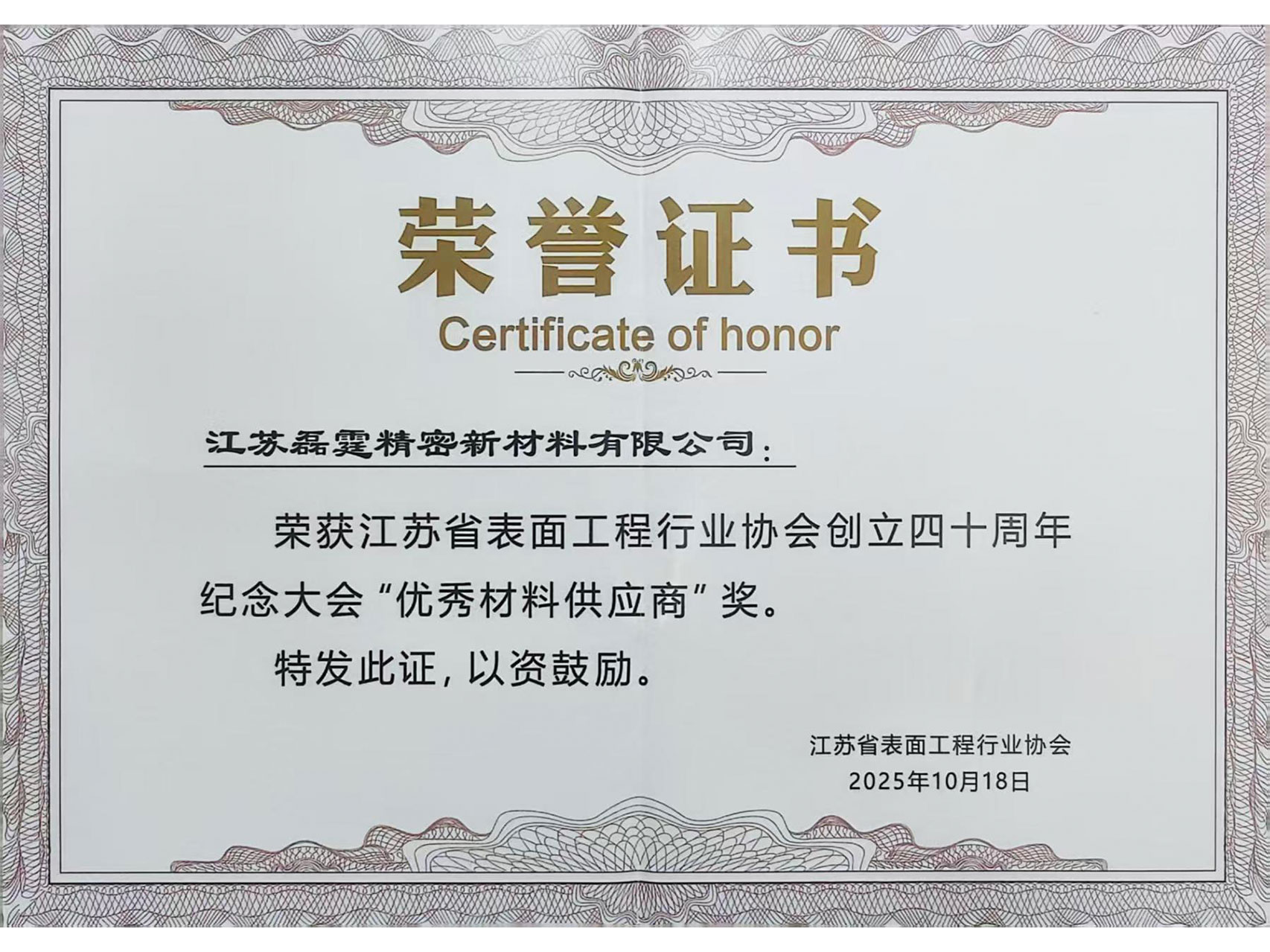在本次大会上,江苏磊霆霆精密新材料有限公司凭借卓越的产品质量、专业的技术服务和良好的行业口碑,从众多企业中脱颖而出,荣获协会颁发的“优秀材料供应商奖”、“江苏表面工程刊物合作奖”