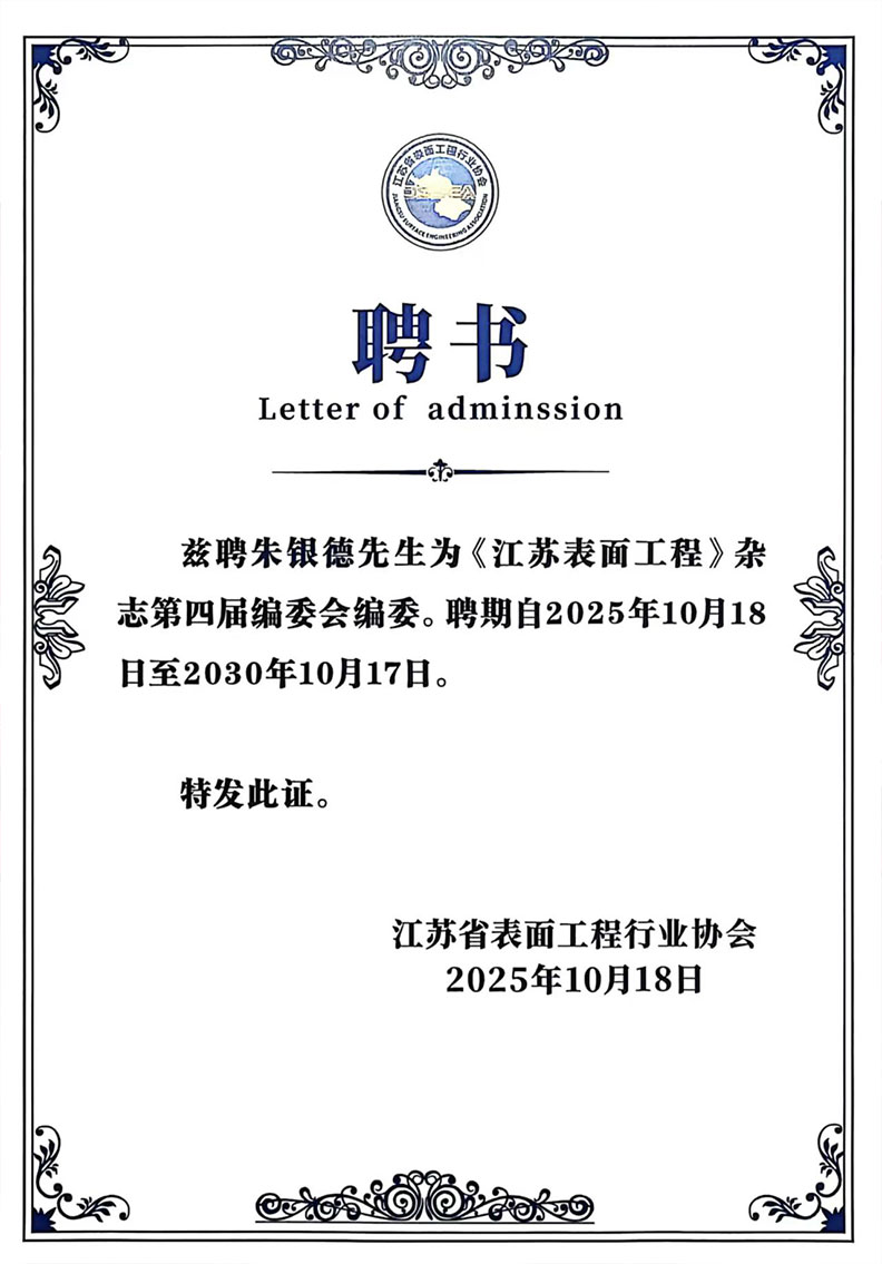 与此同时,在同期召开的《江苏表面工程》杂志第四届编委会成立大会上,总经理朱银德受聘为编委会编委,这标志着江苏磊霆在行业技术交流、学术研究及知识传播中的地位与责任跃升新阶,未来将持续为行业创新发展注入智慧源泉。